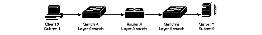 As Figure 2-1 shows, for Client X to communicate with Server Y, which is on another subnet, it must traverse through the following route: first through Switch A (a Layer 2 switch), then through Router A (a Layer 3 switch), and finally through Switch B (a Layer 2 switch). Potentially there is a tremendous bottleneck, which can threaten network performance, because the intersubnet traffic must pass from one network to another.