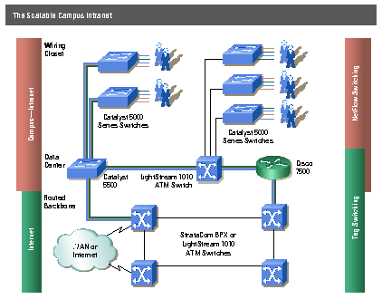 Cisco IOS network services redefine scalability to extend beyond greater bandwidth and port density. Network Address Translation (NAT) scales the usage of IP addresses by mapping many internal IP addresses to just a few external IP addresses. NetFlowTM Switching and Tag Switching capabilities increase performance in Cisco switches and routers. NetFlow Switching streamlines the switching of CPU-intensive traffic in Cisco 7500 series routers -- and recently in the Catalyst® 5000 series switches -- to scale intranet performance exponentially. Tag Switching acts like a postal code to bypass conventional packet-processing across router hops and to speed delivery across very large networks such as the Internet.