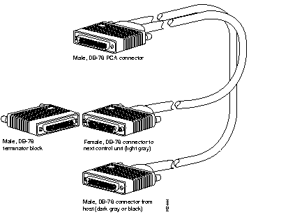 The following illustration shows serial cable CAB-PCA-VA= (part number CAB-PCA-VA) and serial cable CAB-PCA-VB= (part number CAB-PCA-VB), which are used in the Cisco 7500 series and 7000 series systems. The CAB-PCA-VA= has a female DB-78 connector on the Cisco end. The CAB-PCA-VB= has a male DB-78 connector on the Cisco end. Both cables have a DB-48 type-A connector on the network end.