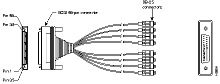 The following illustration shows serial cable CAB-OCTAL-MODEM= (part number CAB-OCTAL-MODEM), which is used in the access server series (Cisco 2509 through Cisco 2512). This cable has a male DB-68 (SCSI II) connector on the Cisco end and eight DB-25 connectors on the network end.