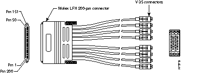 The following illustration shows serial cable CAB-OCT-V35-MT= (part number CAB-OCT-V35-MT), which is used with the PA-8T-V35 port adapter for the Cisco 7000 family, and in Cisco 4000 series systems with the NP-2T16S-V.35 network processor module. This cables has a female 200-pin, Molex connector on the Cisco end and eight 34-pin Winchester block-type V.35 male connectors on the network end. (See Figure 13-1 for the V.35 connector detail.)
