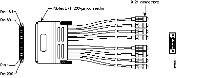 The following illustration shows serial cable CAB-OCT-X21-MT= (part number CAB-OCT-X21-MT=), which is used with the PA-8T-X21 port adapter for the Cisco 7000 family, and in Cisco 4000 series systems with the NP-2T16S-X21 network processor module. This cable has a female 200-pin, Molex connector on the Cisco end and eight 15-pin Winchester block-type X.21 male connectors on the network end. (See Figure 13-1 for the X.21 connector detail.)