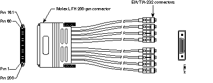 The following illustration shows serial cable CAB-OCT-232-MT= (part number CAB-OCT-232-MT=), which is used with the PA-8T-232 port adapter for the Cisco 7000 family, and in Cisco 4000 series systems with the NP-2T16S-RS232 network processor module. This cable has a female 200-pin, Molex connector on the Cisco end and eight 25-pin Winchester block-type EIA/TIA-232 male connectors on the network end. (See Figure 13-1 for the EIA/TIA-232 connector detail.)