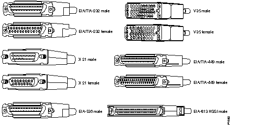 A number of different standards define the signaling over a serial cable (including EIA/TIA-232, X.21, V.35, EIA/TIA-449, EIA-530, and EIA-613 HSSI). Each standard defines the signals on the cable and specifies the connector at the end of the cable. The documentation for the device being connected should indicate the signaling standard used for that device. If you cannot find the information in the documentation, use the illustrations inside to select the signaling standard required. Select the connector in Figure 13-1 that will mate with the connector on your device, not the illustration that looks like the connector on the device.