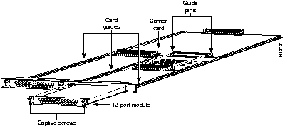 You can install up to two Microcom carrier cards (Figure 10-84) in any two slots of the access server chassis. Each Microcom carrier card includes two slots in which you can install two 12-port modem modules, as described below.