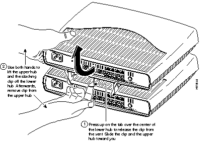 Note Although the following figure shows how to unstack hubs, these instructions also apply to all Cisco products designed to be stacked with the hub including the Cisco 1600 series router.