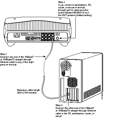 Connect PCs, workstations, routers, or servers to the hub ports 1 through 8, as shown in the following illustration. The PCs and workstations must have a 10BaseT or 100BaseTX network interface card (NIC).