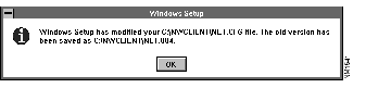 Windows will modify your WIN.INI, SYSTEM.INI, PROTOCOL.INI, AUTOEXEC.BAT, and NET.CFG files. Two dialog boxes appear. See Figure 3-11 and Figure 3-12.