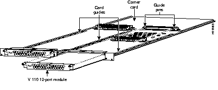 You must install V.110 modules in a carrier card or a dual E1/PRI card, which are not included with this kit. The carrier card, shown in Figure 2, is a wide, narrow card with two slots in which you can install up to two V.110 modules (or other supported modules). Figure 3 shows the dual E1/PRI card, which has only one slot. You can install V.110 modules with any combination of other supported modules.