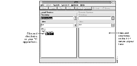 The FTP window looks similar to the Microsoft Windows File Manager window. Just as you use File Manager to work with files on your computer, you can use FTP to delete, copy, and rename files on an FTP server as well as on your computer.