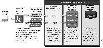 The access device (NAS, firewall or router) is configured to direct all user access requests to the CiscoSecure ACS for authentication and authorization of privileges. Using the TACACS+ or RADIUS protocol, the access device sends authentication requests to the CiscoSecure ACS 2.0, which verifies the username and password either against the Windows NT User Database or the CiscoSecure ACS User Database. The CiscoSecure ACS then returns a success or failure response to the NAS, which permits or denies user access.