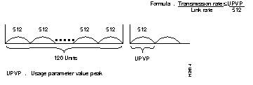 The measurement period can be specified in units of 1 through 120. Each unit represents a window time of 512 cells. The usage parameter value peak (UPVP) represents the number of cells within a measurement period. The peak value equals the UPVP x unit. The measurement period within the window is Nw. P4 of the set tparam command sets Nw (see the section "set tparam" in the appendix "Command Reference"). Figure 1-5 shows the traffic measurement period formula: