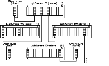 Prepare the slave LightStream 100 switch for interconnecting to other LightStream 100 switches. The slave LightStream 100 switch can be directly connected to a master LightStream 100 switch (from which it receives clocking signals) or it can be indirectly connected to a master LightStream 100 switch. Indirect connection is achieved by connecting the slave LightStream100 switch to another slave LightStream 100 switch that, in turn, is connected to a master LightStream 100 switch.
