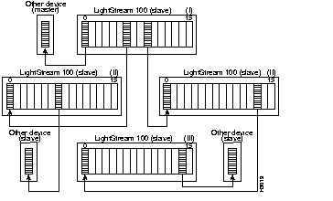 Step 14 Connect the optical cable in slot 0 of the LightStream 100 switch to the master device (router or terminal equipment). If other LightStream 100 units are connected, connect an optical cable from any slot (except 0) on a slave LightStream 100 switch to slot 0 of another slave LightStream 100 switch.