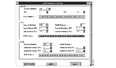 When the csadmin command is executed, the Cisco ATM Administrator retrieves values from the active Driver. You may find it beneficial to make configuration modifications, then switch to another window to review the operation of the VLAN(s), and then save the configuration settings to NT registry.