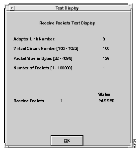 The receive test requires that another node be transmitting packets on the same VC. If another system is not sending data to the system, the test times out in 20 seconds and a message box is displayed.
