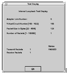 The Internal Loopback test transmits ATM packets between the local system and the Cisco ATM SBus adapter. No loopback cable is required.