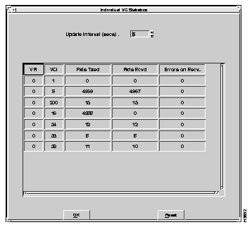 To display these statistics, select the Display Individual VC Statistics option from the Driver Statistics submenu. Enter the update interval to identify how often the test results should update to show previous test results. After the specified number of seconds, the test results are updated to reflect the previous seconds of test activity.