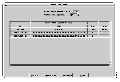 An ATM ARP server table must be defined to collect and maintain information required for virtual LAN operation. This window controls how the connection to the ARP server is set up.
