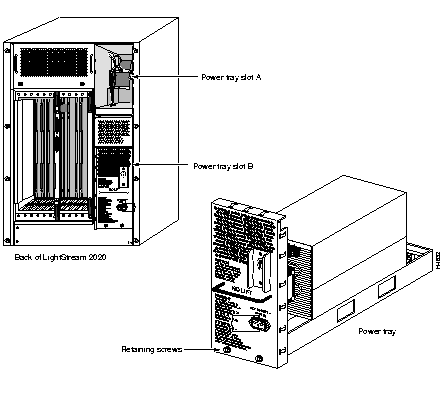 This procedure explains how to convert a LightStream 2020 chassis using a single power cord into a chassis that can use dual power cords. Because they enable you to connect a single chassis to two separate power sources, dual power cords minimize the effect of power failures on your network.