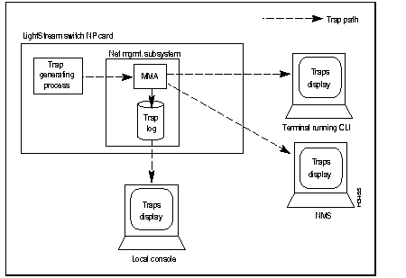 By default, the MMA writes the traps to a log file on the switch's network processor (NP). From there, traps are sent to the local console, if one is present. Traps can also be displayed on one or more NMSs, as well as on a terminal running the CLI.