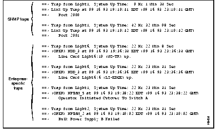 The SNMP trap format is defined by prevailing MIB-II specifications, while enterprise-specific traps are specific to the LS2020 switch. Figure 1-2 shows a sample trap display from nodes called Light1 and Light6. The display contains both SNMP and enterprise-specific traps.