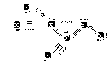 Hosts A and C are connected to the network through ATM interfaces, so they do all their AAL processing internally. The network does not do any processing for hosts A and C. Hosts B and D are connected to native Ethernet interfaces on Nodes 1 and 2. Therefore, Node 2 does all the AAL processing for Host D. Node 3 does no AAL processing.