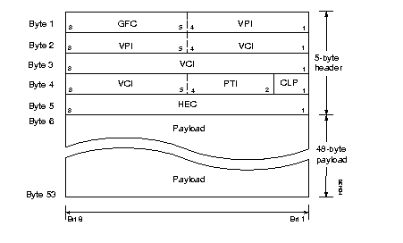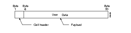 Every ATM cell is 53 bytes long. The first 5 bytes contain header information, and the remaining 48 bytes contain the payload (see Figure 1-8).