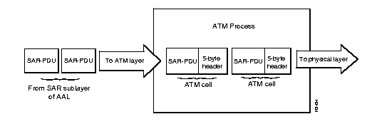 The ATM layer accepts the 48-byte SAR-PDUs from the SAR process, adds a 5-byte header to each, and produces ATM cells for transfer to the physical layer (see Figure 1-14).