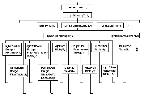 Figure 7-20 shows the lightStreamBridge and lightStreamLanPort branches in the lightStreamInternet subtree of the LS2020 private MIB. (The lightStreamInternet object is defined near the beginning of the MIB file.)
