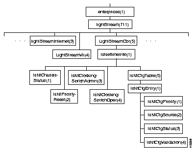 Figure 7-21 shows the lightStreamVli subtree in the LS2020 private MIB. (The lightStreamVli object is defined near the beginning of the MIB file.)