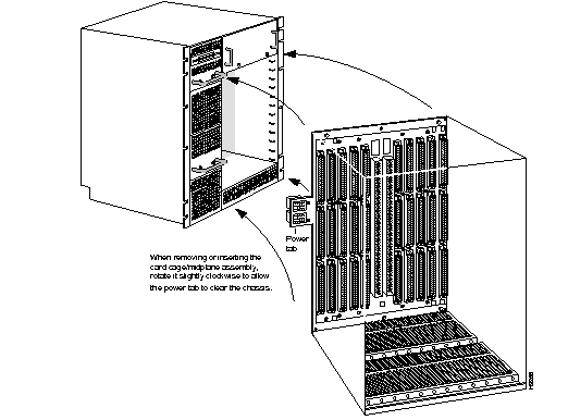 Step 10 Pull the card cage (with the midplane still attached at the rear) out of the chassis. As you remove this assembly, rotate it slightly clockwise to allow the power tab to clear the chassis. (See Figure 3-14.)