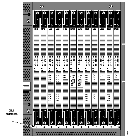 The list below outlines the types of cards that can be installed in each slot in the front of a LightStream 2020 chassis. Figure 4-6 shows the slot numbers.
