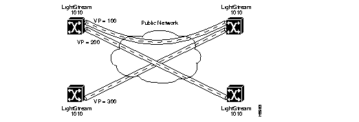 The dashed lines indicate the PVPs which interconnect the ATM switches. Each of these VPs are logical trunks over which signaling (on channel VP=X, VC=5) and PNNI (on channel VP=X, VC=18) can operate normally. Switched Virtual Circuits (SVCs) can be routed and signaled across the VP tunnel as if both endpoints were connected by a physical link.