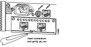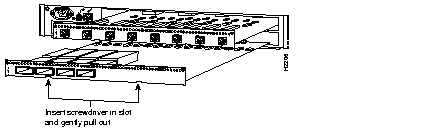 Step 3 Gently pry the line card out of the slot with a flat-blade screwdriver (see Figure C-3). After traveling approximately half an inch, the card will be free from the connector and will slide out easily.