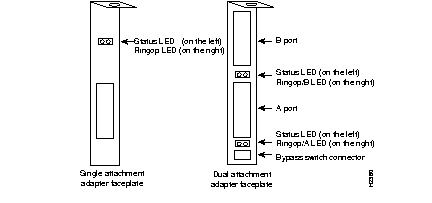 Each adapter has two LED indicators on the faceplate so that you can easily monitor the adapter's internal status and the FDDI link. Figure 1-5 shows single attachment and dual attachment FDDI EISA SGI adapter faceplates, including the LEDs.