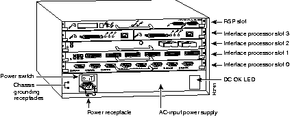 The Cisco 7505 has five slots: four interface processor slots (0 through 3) and one slot for the Route Switch Processor (RSP1 or RSP4). The Cisco 7505 uses a single power supply, with two models available: DC input or AC input.