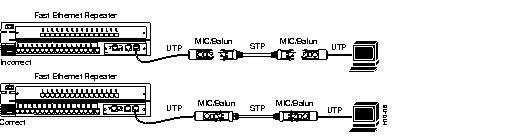 ![]() | Caution To prevent potential loopback problems when using shielded twisted pair (STP) cable in a Token Ring network environment, make sure media interface connectors (MICs) and baluns are always connected when they are part of a link connected to a Fast Ethernet repeater (see Figure 2-9). |