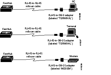 Use the thin, flat, RJ-45-to-RJ-45 rollover cable and appropriate adapter, both supplied with the BMM, to connect the FastHub RJ-45 console port to a PC, terminal, or modem. Perform the following steps to connect the cable. See the "Console Cables and Adapters" section in the "Connectors and Cables" appendix for cable and adapter pinouts and to identify the rollover cable.