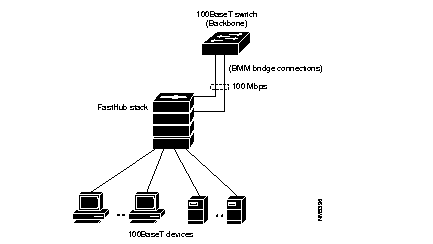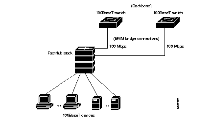 Using a BMM, 100BaseT devices can be connected to a backbone of 100BaseT switches. BMMs in a FastHub stack can be connected to separate backbone switches (see Figure 2-3) or redundantly connected to the same backbone switch (see Figure 2-4).