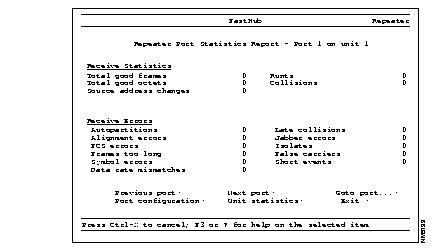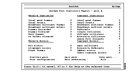 When you select the Bridge Port Statistics Report, the Bridge Port Selection menu is displayed (see Figure 3-24). After you select a unit number and a port number, the Bridge Port Statistics Report is displayed. For example, if you select port B on unit 1, the Bridge Port Statistics Report is displayed (see Figure 3-28).