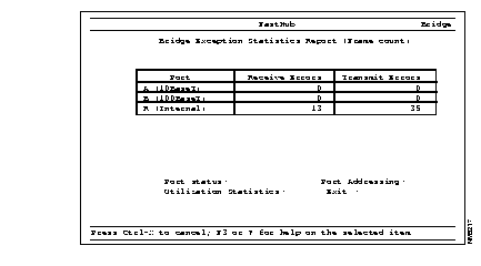Use the Bridge Exception Statistics Report menu to display the number of receive errors and transmit errors for each port configured by the Bridge Port Configuration menu (see Figure 3-40).