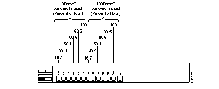 | Bandwidth utilization | Use the LEDs to determine what percentage of the hub total bandwidth is being used at any one time. Figure 1-4 and Figure 1-5 illustrate this function. |