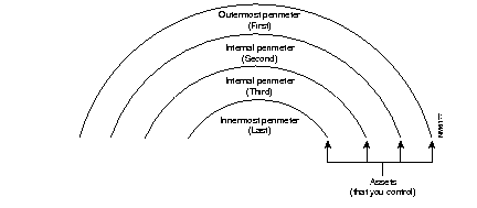 Each network can contain multiple perimeter networks within it. When describing how perimeter networks are positioned relative to each other, we observe three types of perimeter networks: the outermost perimeter, internal perimeters, and the innermost perimeter. Figure 3-2 depicts the relationship among the various perimeters. Note that the multiple internal perimeters are relative to a particular asset, such as the "internal perimeter that is just inside the firewall server."