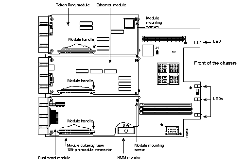 ![]() | Caution Some network processor modules are secured to the rear of the chassis with two external screws. On modules with external rear mounting screws, including multimode Fiber Distributed Data Interface (FDDI) modules, these screws must be removed before the module can be safely lifted out of the chassis. |