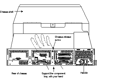 Step 1 Reinsert the component tray into the chassis shell, pushing on the back of the tray while at the same time pressing on the chassis release screw with the thumb of your right hand. (See Figure 3-1.)