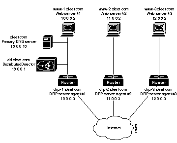 You have set up www.sleet.com as a subdomain and set up the Director IP address as the authoritative DNS caching name server for that subdomain. At the same time, you also set up A records giving the IP addresses of all of the mirrored distributed servers for this subdomain. You have specified the DRP server agent (router) which is associated with each distributed server. The commands shown are required when DRP metrics are used.