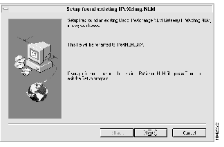A dialog appears. If the IPeXchange NLM version software is already installed in this location, the dialog will notify you. If you continue with the installation, the software is installed and the previous version is stored as IPEXNLM.SAV, IPEXREAD.SAV, IPEXSTAT.SAV, and IPEXCFG.SAV (the configuration file).