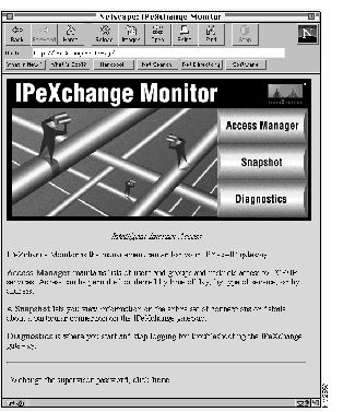 The main monitor window shows the three main features of the monitor: access control, snapshots for monitoring connections, and diagnostics for tracing the Cisco IPeXchange Internet Gateway. It also has a link for changing the monitor supervisor password.