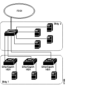 Figure 3-7 shows an EtherSwitch 1420 connected to several 100BaseT servers. The EtherSwitch 1420 has a 4-port shared 100BaseFX module and a switched 100BaseFX module. The servers in building 2 are configured with 100BaseFX adapters.